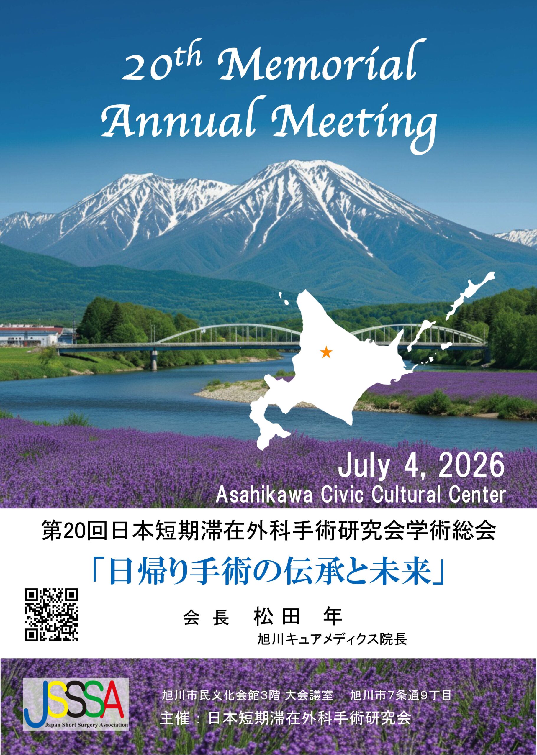 この度、令和8年7月4日(土)に、第20回日本短期滞在外科手術研究会学術総会を、北海道のほぼ中央に位置する旭川市の市民文化会館にて開催させていただくことになりました。第20回という記念すべき学術総会を、私の生まれ故郷である旭川の地で会長として担当させていただけますことは、大変光栄であると同時に、その重責に身が引き締まる思いでございます。これもひとえに会員の皆様、そして関係各位のご指導ご鞭撻の賜物と、心より感謝申し上げます。
